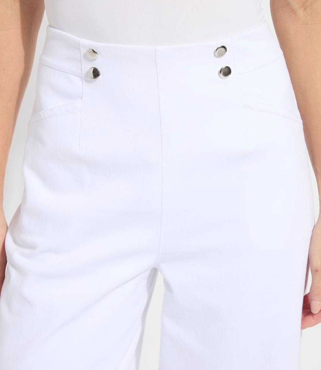 A modern twist on nautical style, the Dion Sailor Crop Palazzo in white denim brings timeless polish with a relaxed silhouette. Designed with a flattering high rise and wide-leg crop, these pants balance structure and ease for a refined yet laid-back look.