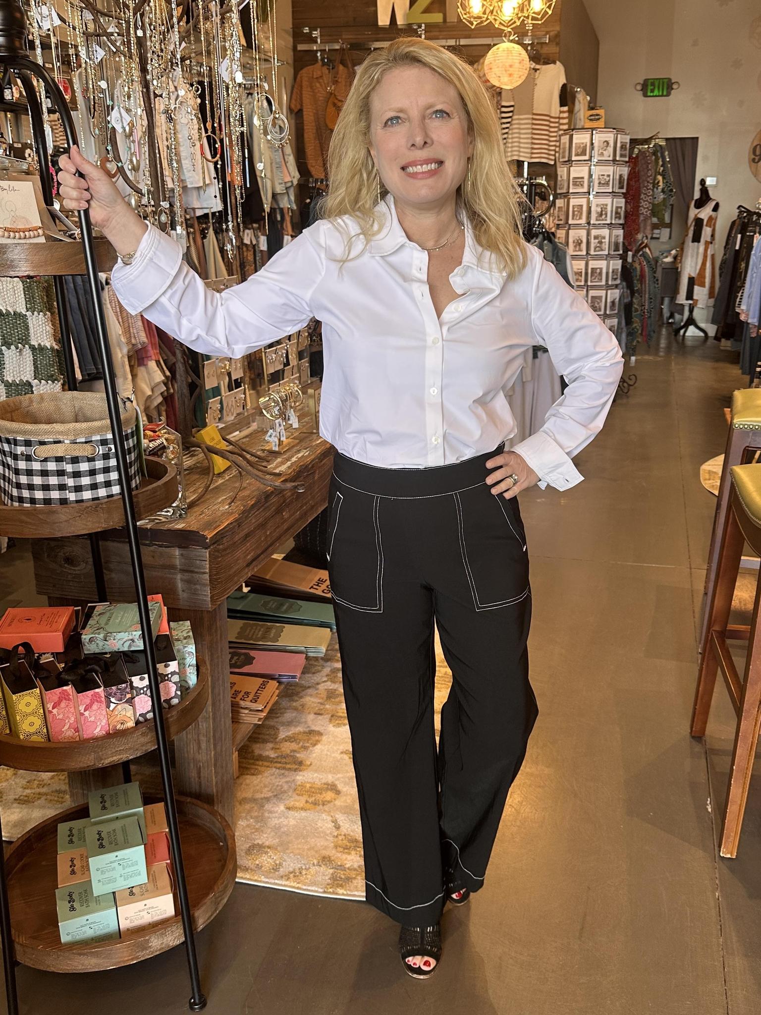 Crafted from a soft, breathable fabric blend, these pants deliver all-day comfort while maintaining a polished finish. The contrast stitching adds a touch of contemporary detail, highlighting the clean lines and front patch pockets. Pair them with a tucked-in blouse or a casual tee for effortless sophistication.