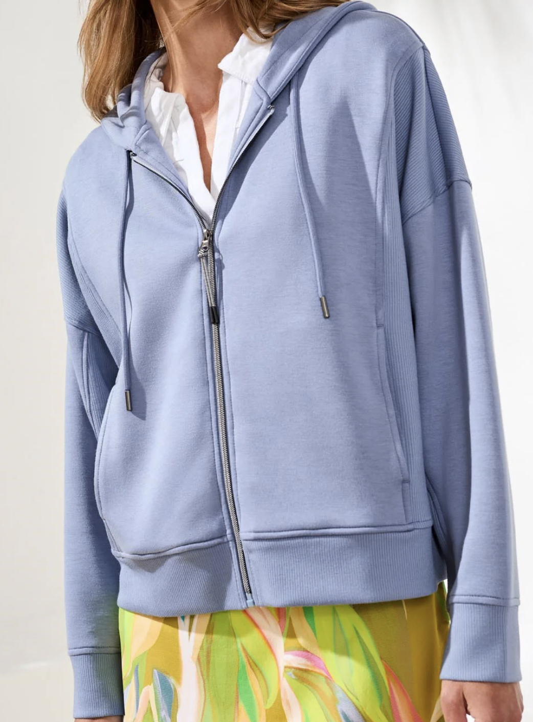 Designed with a full-zip front, adjustable drawstring hood, and subtle ribbed cuffs, this cardigan delivers both function and modern appeal. The Dust Blue hue adds a fresh, contemporary touch that pairs beautifully with prints, neutrals, or matching Techno Lux pieces.