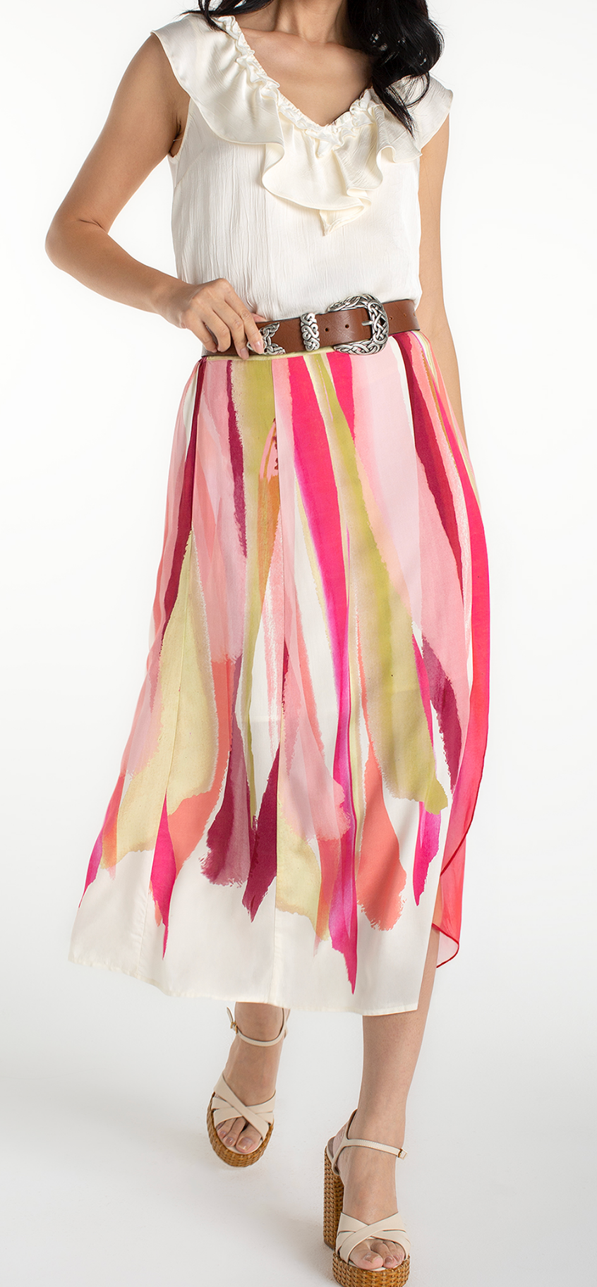 Add a burst of color and effortless elegance to any outfit with this pull-on woven maxi skirt in pink multi. Designed with a flattering A-line silhouette, this skirt flows beautifully with every step. The vibrant brushstroke-inspired print blends shades of pink, coral, and citrus for a fresh, artistic look that stands out in any season.