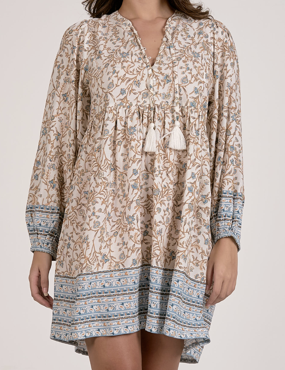 A split V-neckline with tassel ties lends a playful touch, complemented by long sleeves with patterned cuffs and a coordinating border print along the hem. Perfect for casual days, weekend getaways, or warm-weather outings, this dress pairs easily with sandals or ankle boots for an effortlessly chic look.