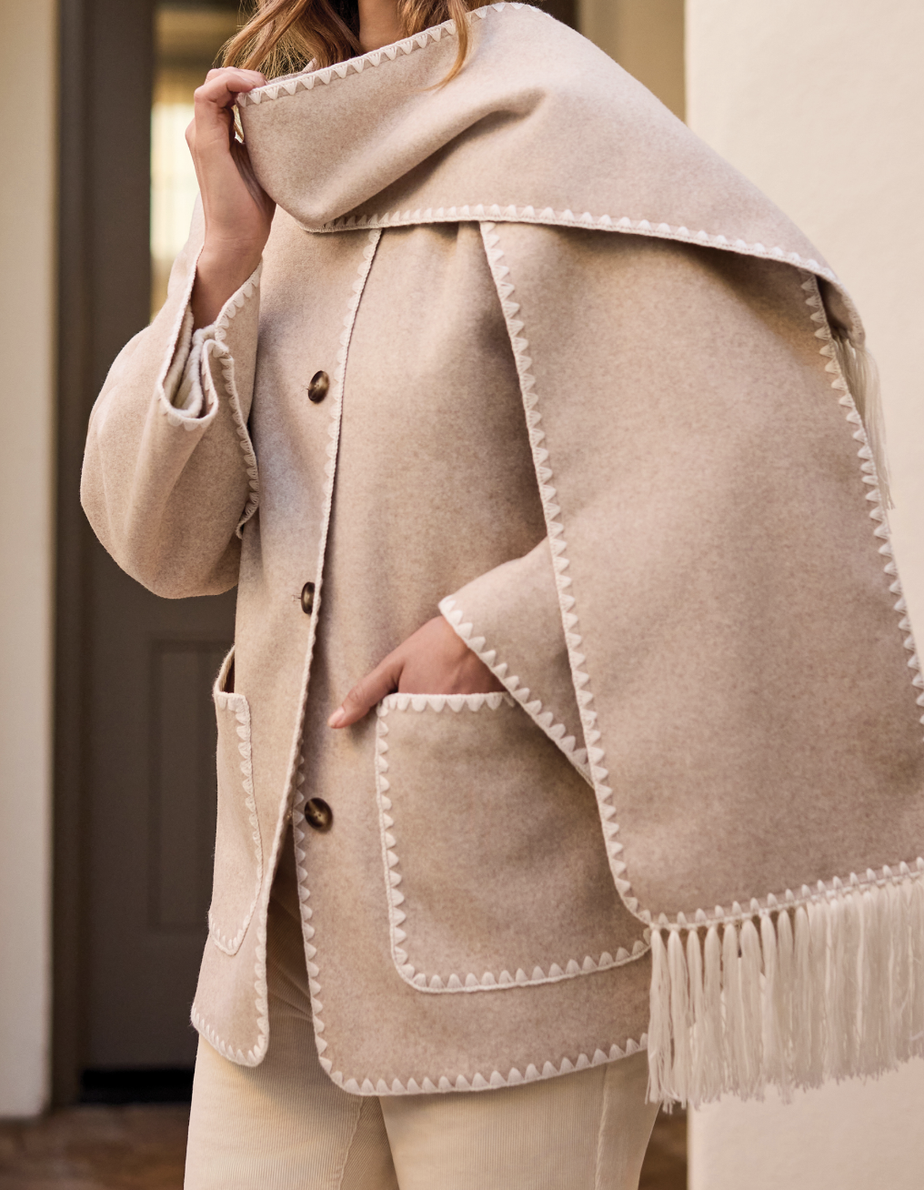 A refined outerwear piece that blends warmth with versatility. This button-front coat features a soft, wool-blend fabric in a neutral beige tone, accented with contrast whipstitch detailing along the edges. The detachable fringed scarf adds a cozy, layered look that can be styled multiple ways or removed for a streamlined silhouette. Finished with large front patch pockets and tortoiseshell buttons, it’s an effortlessly elegant choice for cool-weather dressing.