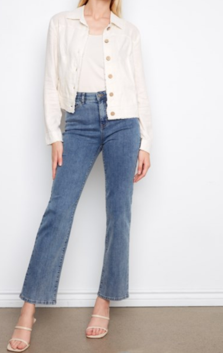 Designed with long sleeves, a classic collar, and wooden-style buttons, this jacket blends timeless tailoring with modern texture. The slightly cropped hem and frayed edge detail add a relaxed, contemporary twist that pairs perfectly with high-waisted jeans, skirts, or tailored trousers.