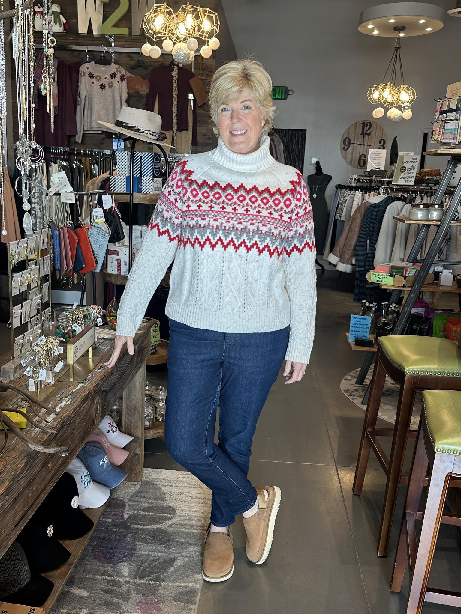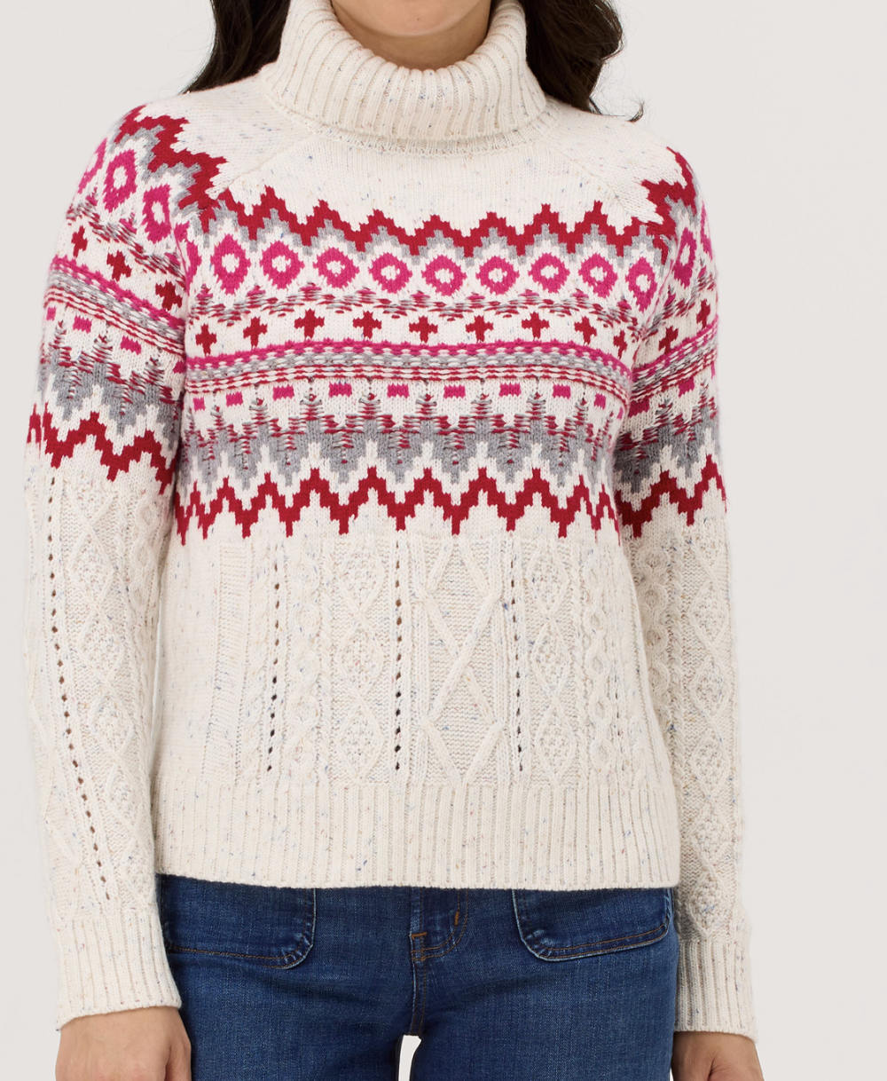 A cozy winter essential with timeless alpine charm. Featuring a soft cable knit body and a striking fair isle pattern in shades of red, pink, and grey across the chest and sleeves, this sweater blends warmth with style. The chunky turtleneck and ribbed trim add extra comfort, making it perfect for chilly days on or off the mountain.
