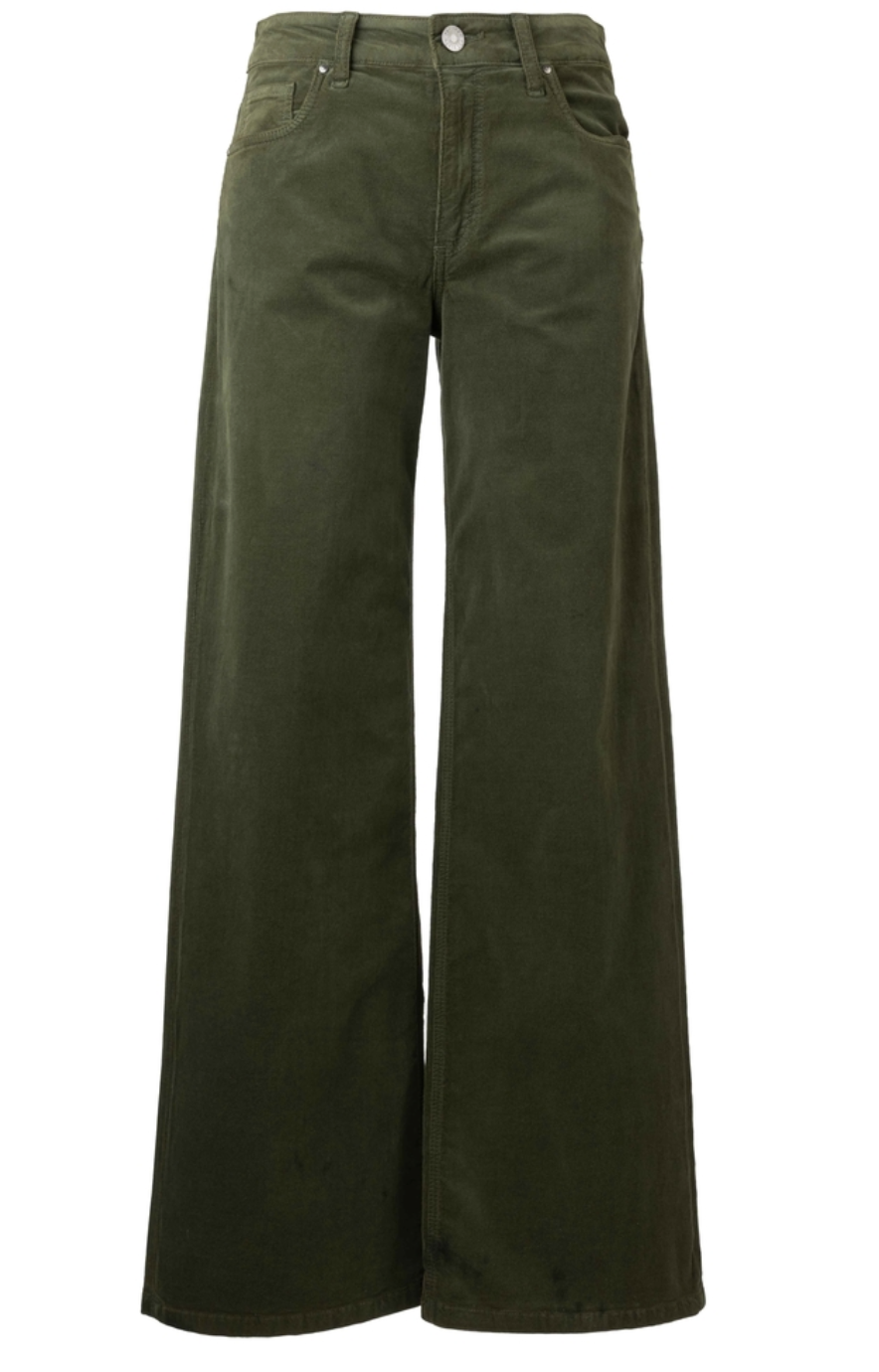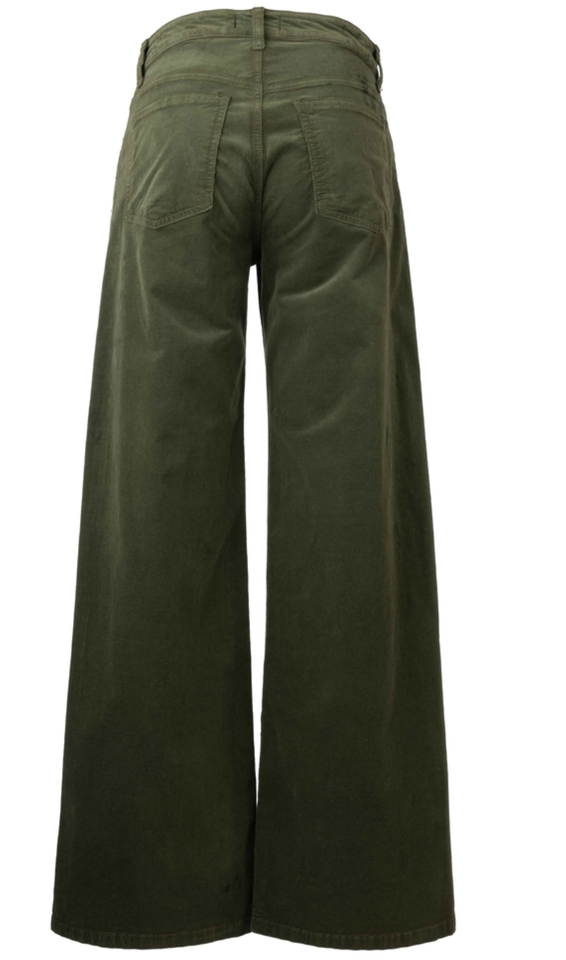 The Jean high-rise wide-leg pants feature a clean hem and structured silhouette for a sleek, modern look. Crafted in a rich olive hue with a soft, velvety finish, they offer a flattering fit through the waist and a relaxed drape through the leg—perfect for pairing with tucked-in knits or crisp blouses.