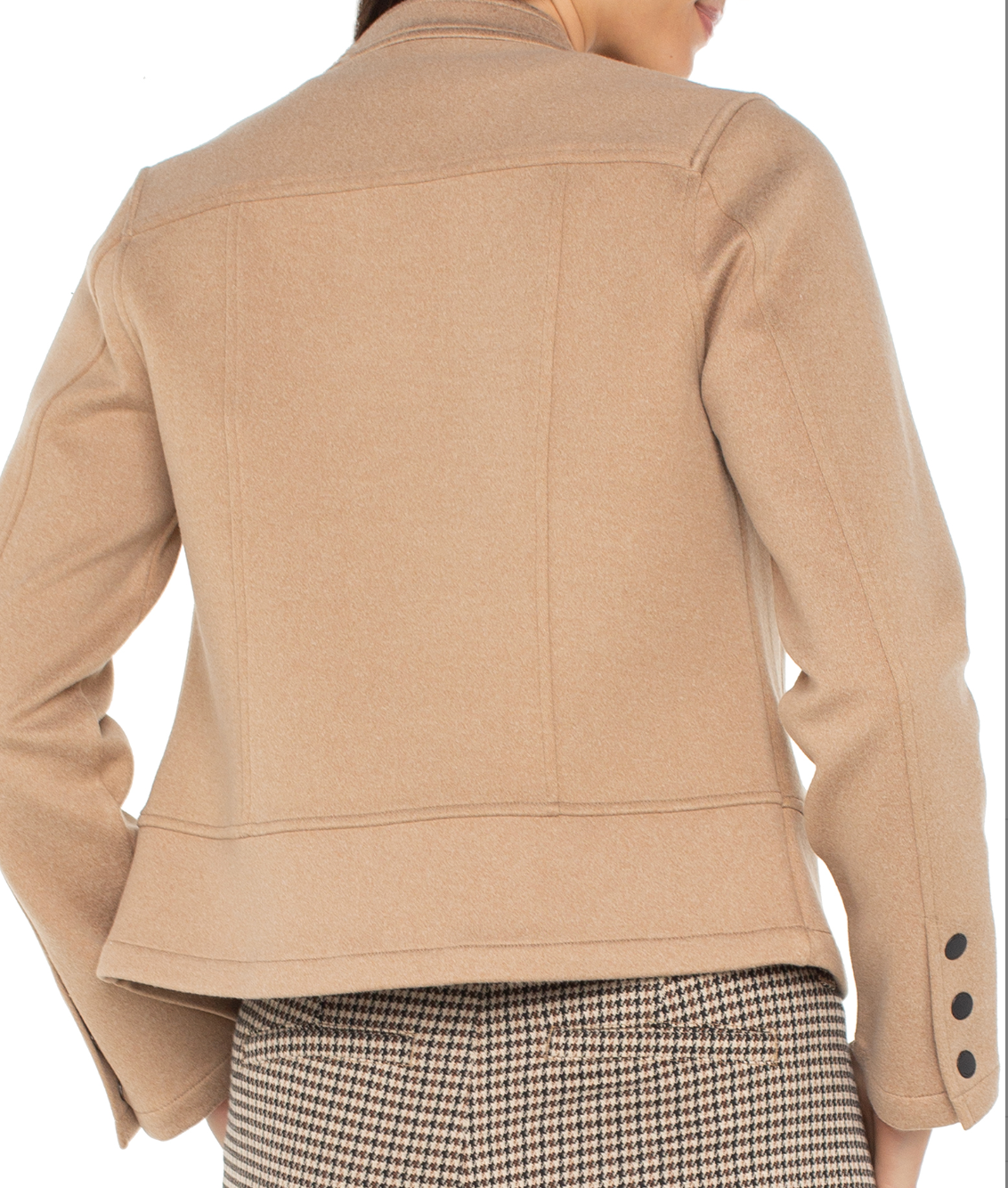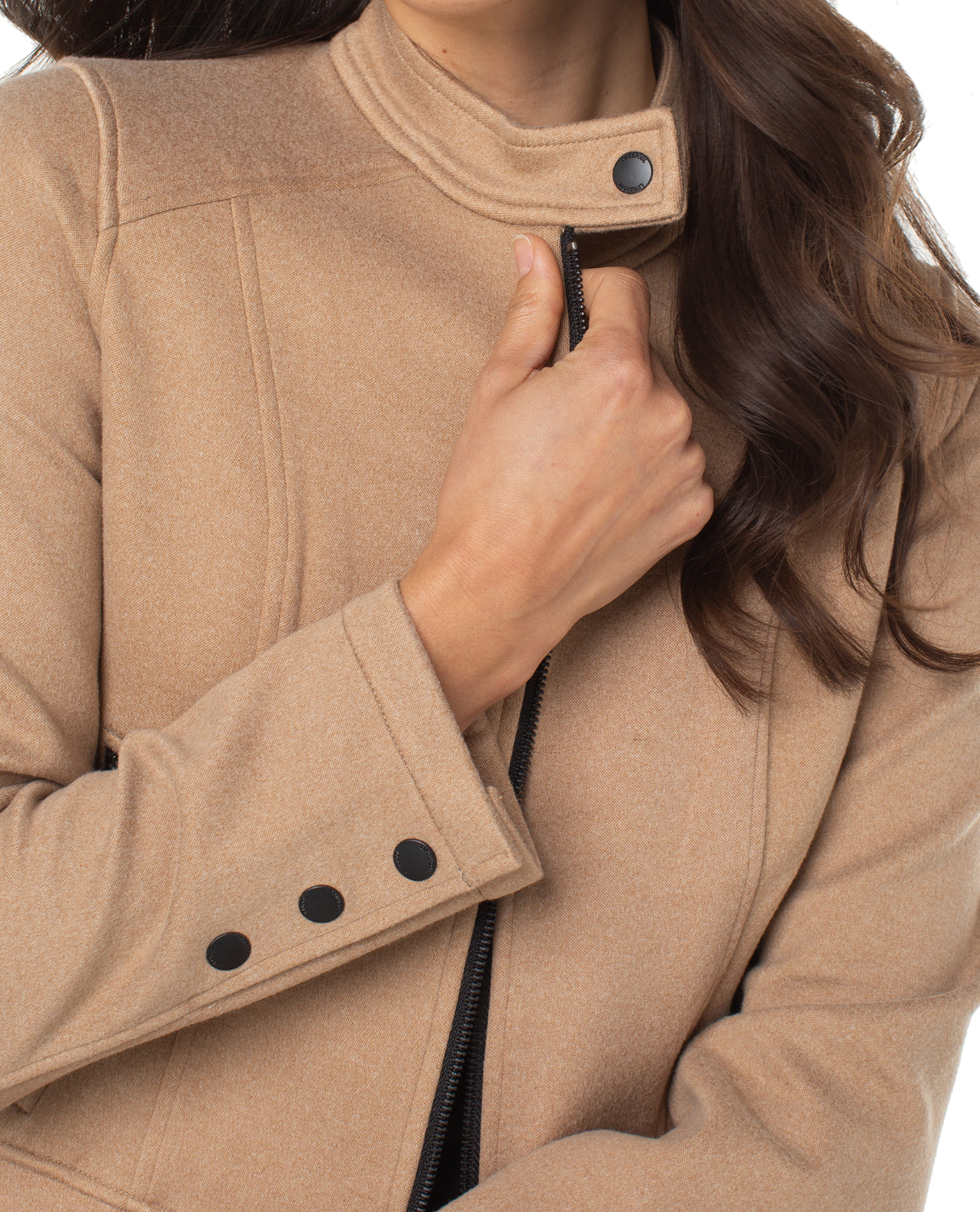 A sleek and modern take on a classic silhouette, this camel biker jacket is the perfect blend of edge and sophistication. Designed with a structured fit, it features a zip-front closure, stand collar with snap button detail, and streamlined seaming for a flattering shape. The soft yet durable fabric offers comfort and style, while the zippered side pockets add both function and flair.