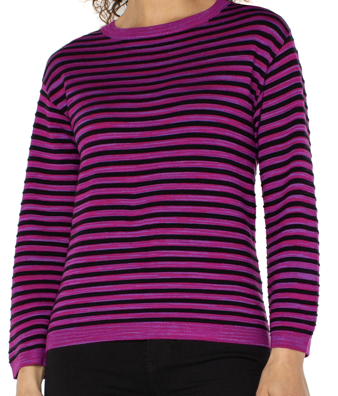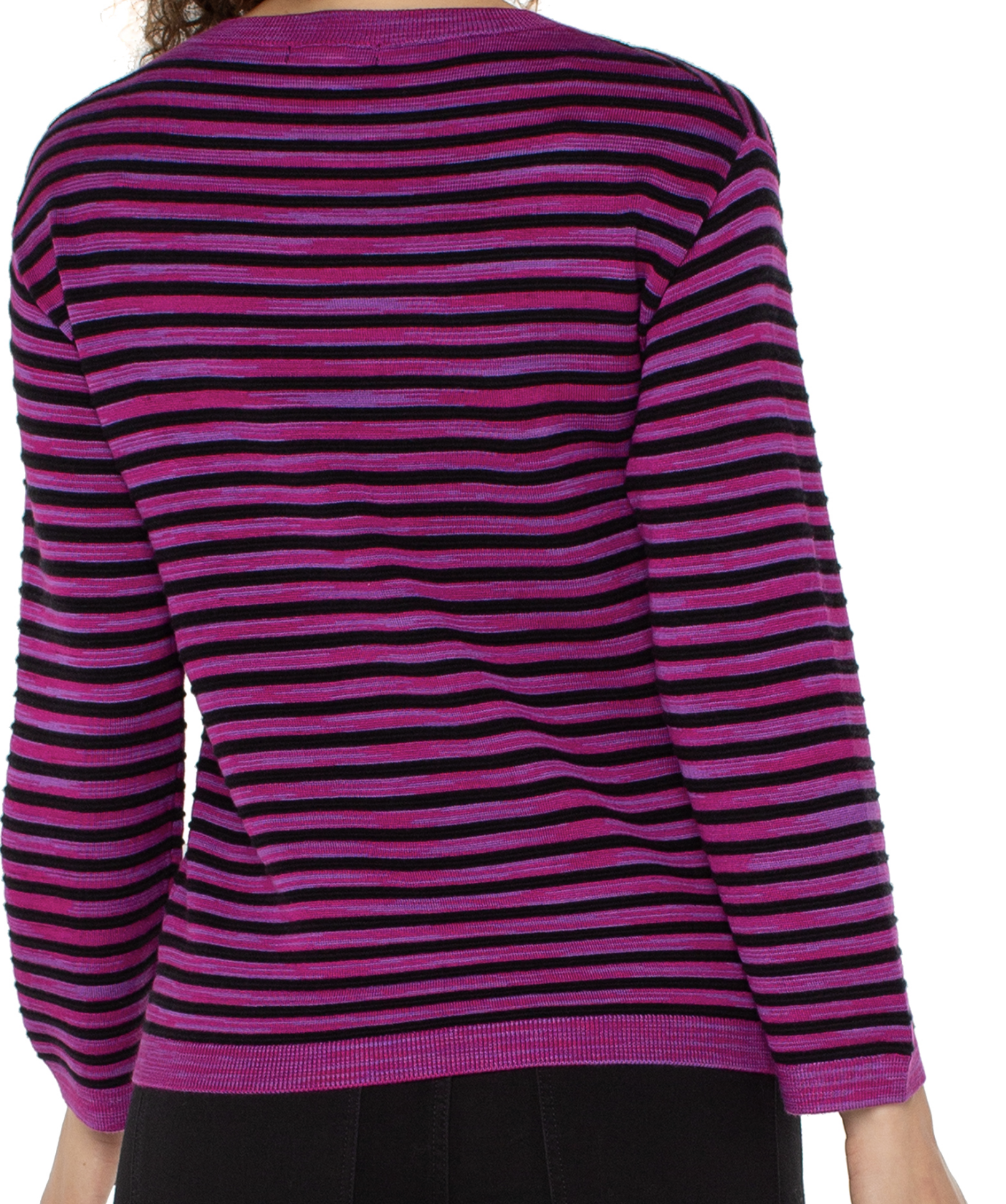 Brighten up any wardrobe with the Liverpool Boxy Boat Neck Sweater in bold fuchsia stripes. This sweater features a relaxed, boxy silhouette and a classic boat neckline for a modern, effortless look. The vibrant fuchsia and black stripes create a striking visual effect, while the soft knit fabric ensures all-day comfort. Perfect for layering or wearing on its own, this sweater pairs easily with jeans, trousers, or skirts for a chic, contemporary outfit. Ideal for adding a pop of color to everyday style.