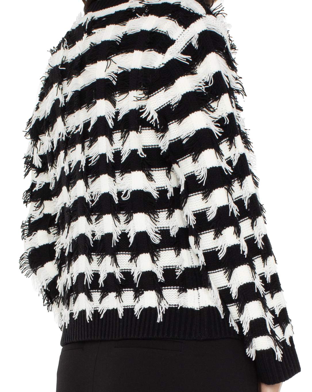 A bold black-and-white striped cardigan with textured fringe detailing. Featuring a button-front closure and ribbed trim, this statement layer adds a modern twist to a classic silhouette. Perfect for elevating casual or office-ready looks.