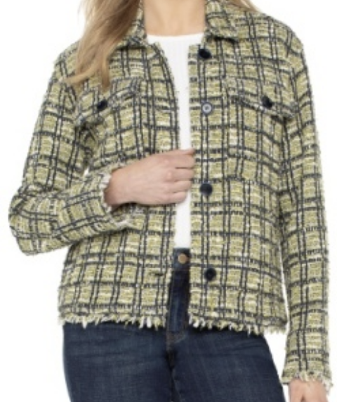Refresh any wardrobe with this Liverpool Shacket in a striking green multi plaid. This shirt-jacket hybrid features a relaxed silhouette, perfect for layering over casual outfits. The textured plaid fabric is highlighted by frayed edges at the hem and cuffs, giving it a laid-back, modern vibe. Classic details like front button closure and chest pockets add both function and style. Ideal for transitional seasons, this shacket brings a bold twist to everyday looks while keeping comfort at the forefront.