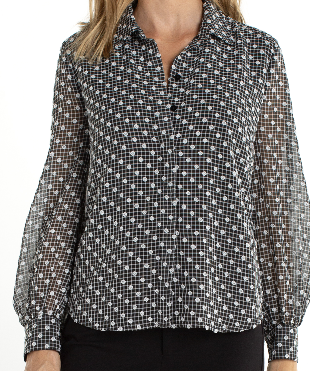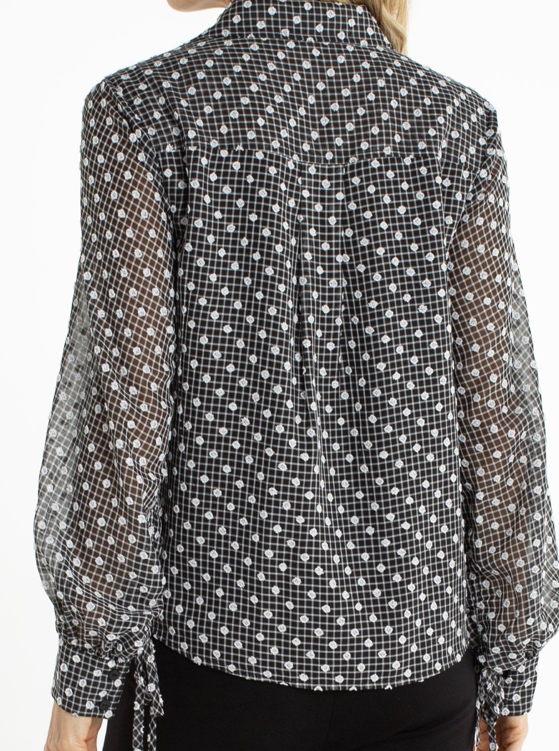 A modern classic with a playful twist, this collared blouse in black and white print brings effortless sophistication to any outfit. The lightweight, semi-sheer fabric drapes beautifully, while the timeless print adds visual interest and versatility. Designed with a structured collar and subtle tie sleeve detail, it blends polished tailoring with feminine charm.