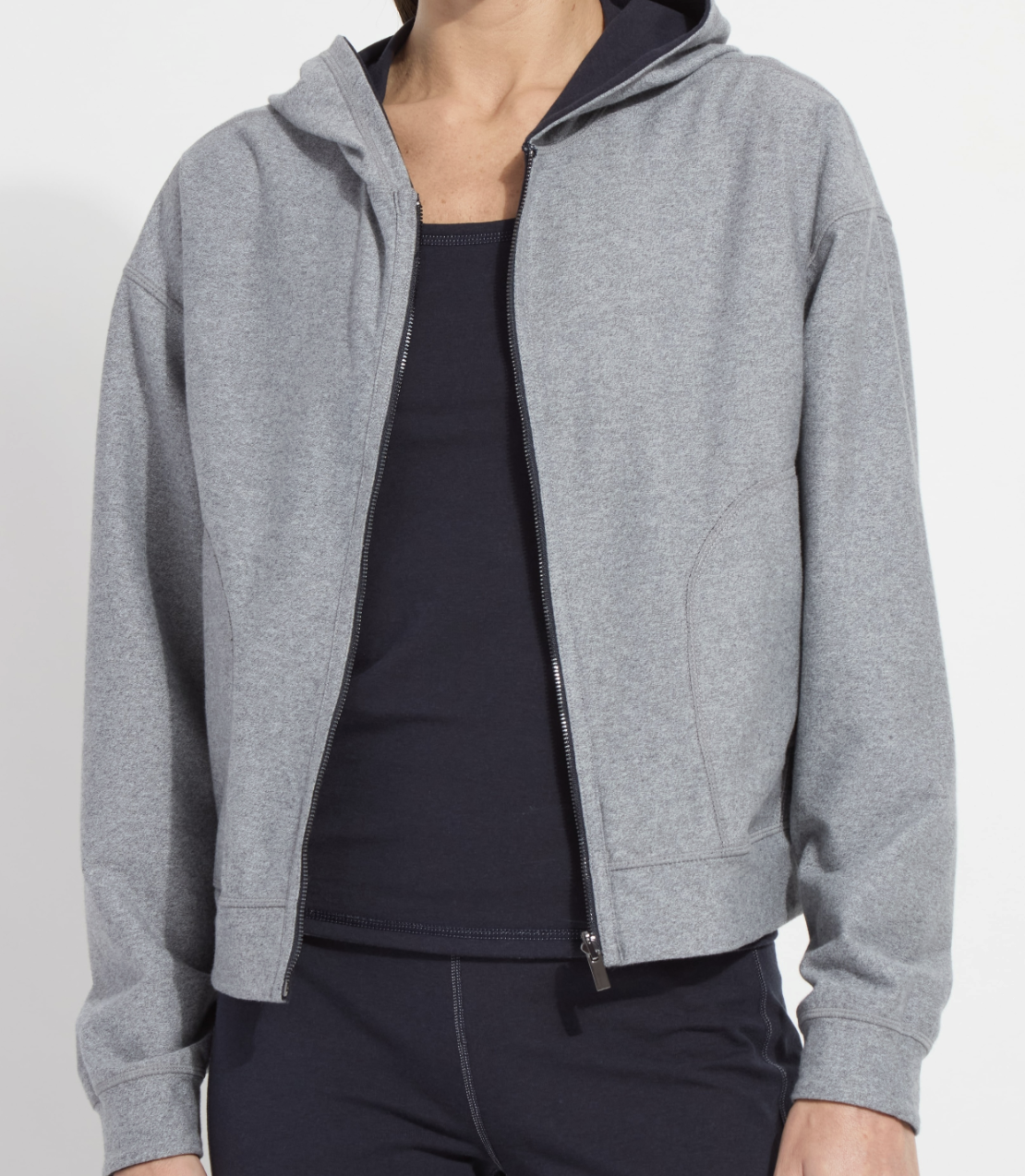 Designed for maximum wearability, it features a fully reversible design—switch between classic navy for a sleek, refined look or gray melange for a relaxed, sporty vibe. The full-zip front, roomy hood, and ribbed cuffs make it an easy layering piece for any season.