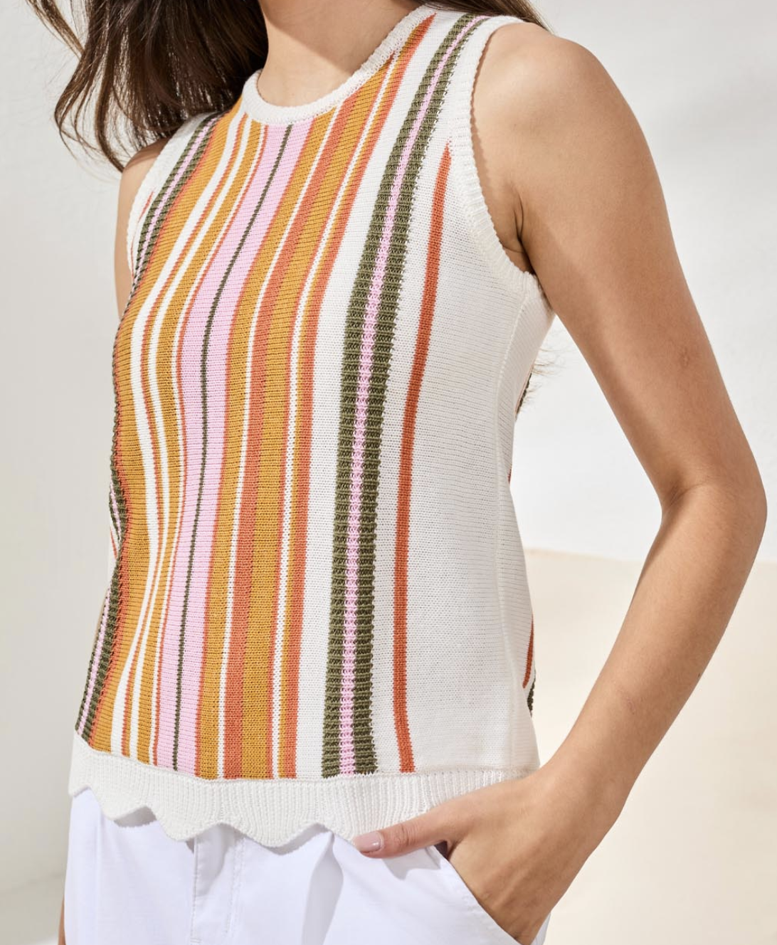 Brighten up any look with this crew neck sleeveless sweater, featuring a playful mix of colors and textures. The vertical stripe design in shades of pink, orange, mustard, and olive adds a cheerful, modern twist to a classic knit silhouette. Crafted from a soft, lightweight fabric, it offers a comfortable fit that’s perfect for layering or wearing on its own. The scalloped hem adds a subtle feminine touch, making it a standout piece for both casual and polished outfits.