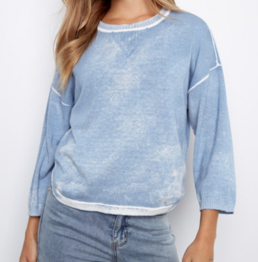 Soft, relaxed, and effortlessly stylish, this Reversed Print 3/4 Sleeve Sweater in Sky Blue brings a fresh twist to casual dressing. The reversed print effect gives it a lived-in, vintage-inspired look, while the curved hem adds a flattering, feminine touch.