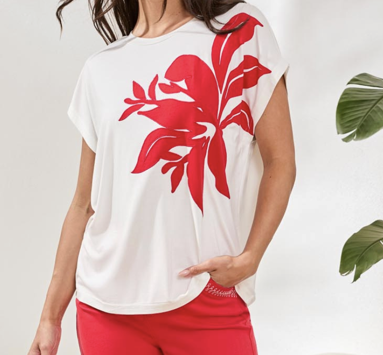 Add a touch of tropical charm to your wardrobe with this Cap Sleeve Top featuring a bold floral applique design. Crafted from a soft and breathable blend of 95% viscose and 5% spandex, this top offers a lightweight feel with just the right amount of stretch for all-day comfort. The relaxed fit drapes beautifully, while the cap sleeves and round neckline create a flattering, casual silhouette.