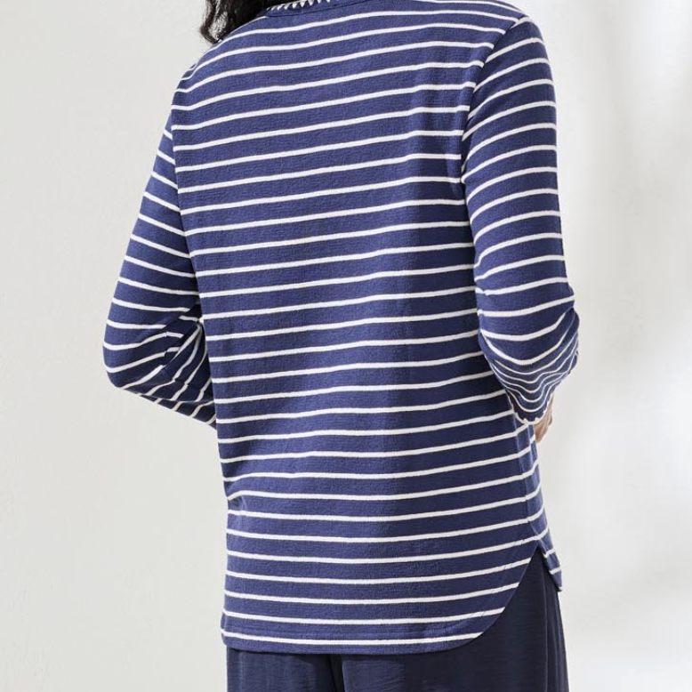 Classic stripes meet modern comfort in this 3/4 Sleeve Crew Neck Top with Contrast Detail. Designed in a rich jet blue hue with crisp white stripes, this top offers a timeless nautical-inspired look that’s perfect for everyday wear.