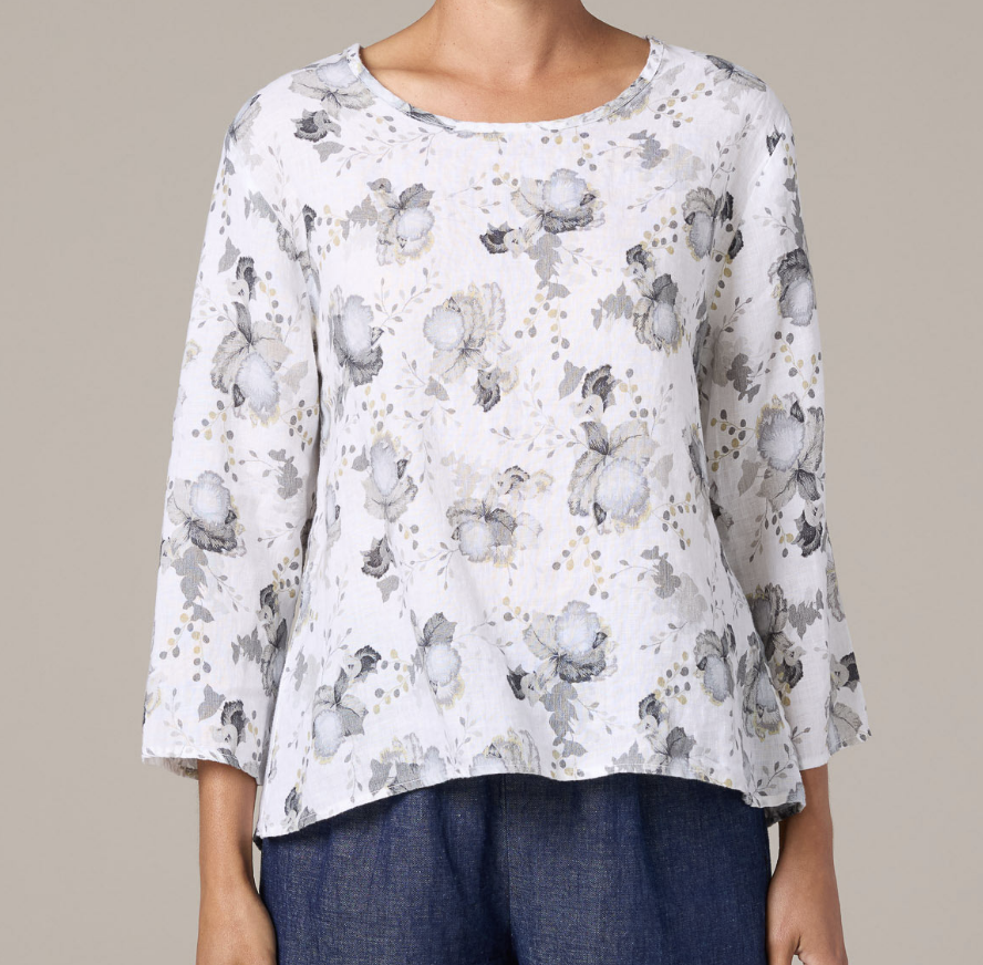 A breezy, feminine silhouette meets modern detail in this 3/4 Sleeve Split Back Top. Crafted from a lightweight linen-blend fabric, it features a soft white base adorned with a delicate floral print in muted grey tones. The relaxed fit drapes beautifully, offering comfort and effortless style for everyday wear.